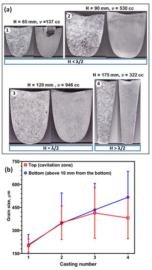 (a) Effect of casting volume and height (H) on the macrostructure after UST of an Al-2Cu alloy and (b) the grain size measured from the top and bottom of the casting. (λ/2 = 125 mm refers to the half wavelength distance of the sonotorde).