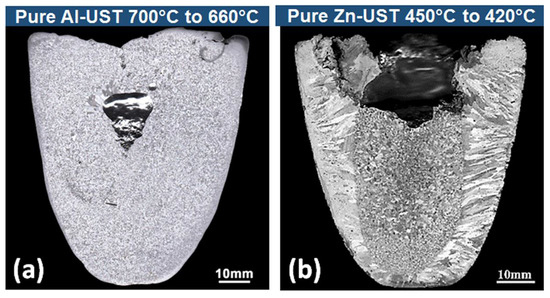 Depending on the properties of the metal (melting temperature, density and thermal conductivity) significant differences were noted in the UST grain structures of pure Zn, Al and Mg. Figure 13 shows the macrostructure of pure Al and Zn where UST is applied from 40 °C and 30 °C above the melting temperature, respectively, until complete solidification.