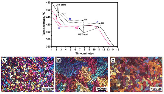 Comparison of grain structures with respect to the temperature range of UST for pure Zn is shown in the Figure 14. The cooling curve in Figure 14 shows three ranges of UST A, B and C. An unpreheated titanium sonotrode was used in all these experiments. The microstructures from each casting condition taken from the centre of the casting is shown in Figure 14A–C.