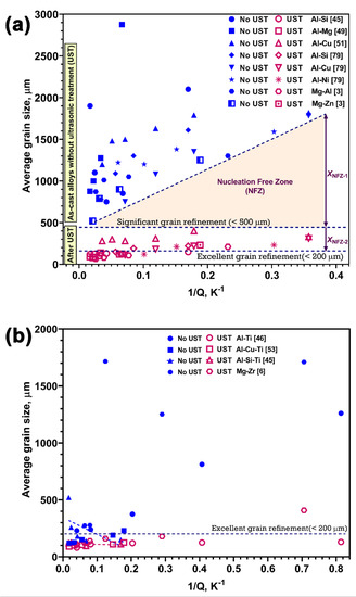- Atamanenko, T.V.; Eskin, D.G.; Zhang, L.; Katgerman, L. Criteria of Grain Refinement Induced by Ultrasonic Melt Treatment of Aluminum Alloys Containing Zr and Ti. Metall. Mater. Trans. A 2010, 41a, 2056–2066. [Google Scholar] [CrossRef]