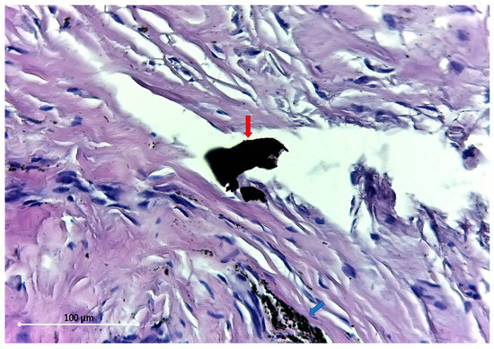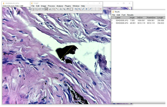 The samples were studied under light microscopy with a Leica DM750 microscope. In order to measure the dimensions of the metallic particles present in the soft tissue, ImageJ software used (