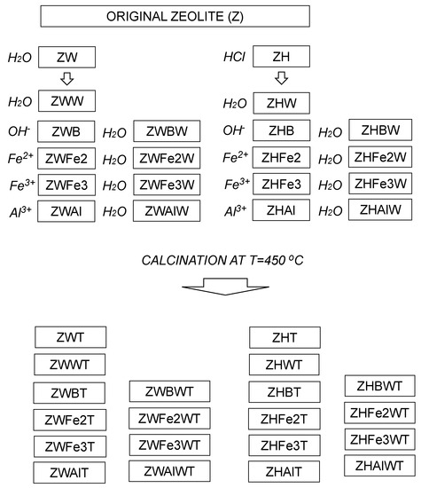Smaller than 0.5-mm diameter fraction separated by sieving from ground Transcarpathian clinoptilolitic tuff localized in Sokyrnytsya, Ukraine [30] was modified according to a procedure described by Swiderska-Dabrowska et al. [22] with some modifications. First, the original zeolite (Z) was pre-treated with 5 bedvolumes of water (ZW) or 5% HCl (ZH) in a reciprocal shaker for 11 h. The treatment media were renewed three times during the first 6 hours (every 2h), and the solid phase was separated by filtration and dried at 105 °C. Parts of the obtained materials were washed thrice with 10 bedvolumes of distilled water (ZWW and ZHW), filtered and 105 °C dried. Next, both ZW and ZH were shaken for 4 h with 5 bedvolumes of 0.1 M solutions of FeSO4, FeCl3 or AlCl3, filtered, adjusted finally to pH 9.0 with 0.1 M NaOH, filtered again, and 105 °C dried (the respective procedures are abbreviated as Fe2, Fe3, and Al). Parts of the above materials prior to drying were washed thrice with 10 bedvolumes of water (abbreviation with additional letter W at the end). The treatment with NaOH (adjustment to pH = 9 with and/or without the final washing) was performed also for not metal cations—modified materials—ZW and ZH (the respective samples are abbreviated with letters B—or BW, if finally washed). Samples of all modified zeolites were additionally calcined at the temperature T = 450 °C (calcination is abbreviated with the letter T). The calcination temperature was chosen according to Swiderska-Dąbrowska [22,23], who obtained the best Fe-modified zeolite at 450 °C (point of zero charge at pH 7 and high values of zeta potential over a wide pH range), whereas 350 °C calcination resulted in lowest values of zeta potential. The scheme of the modification procedure is presented in Figure 1.