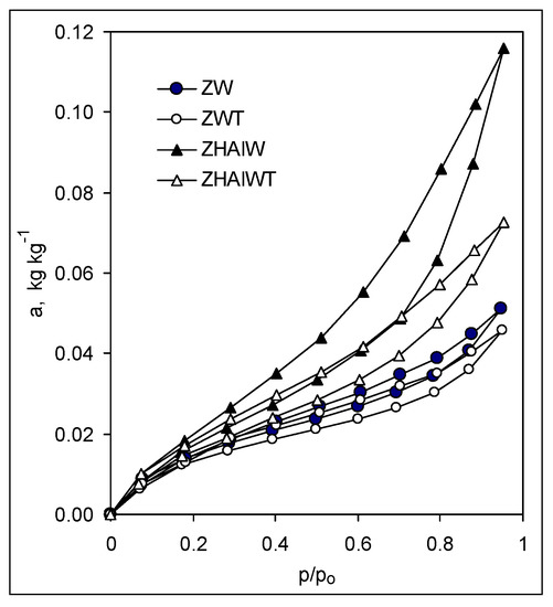 That a final washing of the modified materials leads in general to a decrease in the surface area, amount of mesopores, and shift in surface potential toward more negative values seems obvious, because a part of the modifier was washed out. As it can be seen (Figure 4), calcination resulted in similar effects: a decrease of specific surface area, mesopore volume, and value of isoelectric point, as well as an increase of both the adsorption energy and mesopore radius. This may be due to the dehydration of surface hydroxyls during calcination. However, an increase in the binding strength between the hydroxide modifier and the zeolite surface during calcination may increase the stability and mechanical resistance of the modified zeolites [23], which is an advantageous feature for the modified zeolites’ applications.