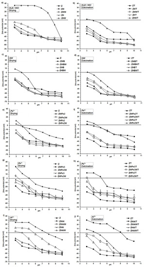 Zeta potential vs. pH dependence for the zeolie mofified by (a) the pretreatment with H2O or HCl; (b) the pretreatment with H2O or HCl and calcination; (c) the alkalization; (d) the alkalization and calcination; (e) the Fe2+ action; (f) the Fe2+ action and calcination; (g) the Fe3+ action; (h) the Fe3+ action and calcination; (i) the the Al3+ action; (j) the Al3+ action and calcination. The abbreviations of the sample names are in accordance to Figure 1.