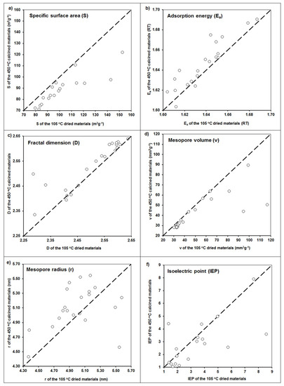 Changes in (a) specific surface area, (b) adsorption energy, (c) fractal dimension, (d) mesopore volume, (e) mesopore radius, and (f) isoelectric point values after calcination of the studied materials. Dashed lines are 1:1 dependencies.