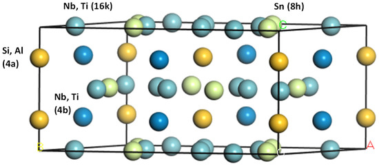 The Nb–Sn–Si and Ti–Sn–Si ternary phase diagrams have been reported by Sun et al. [14] and Bulanova et al. [15], respectively. In both ternary systems the existence of a ternary W5Si3 type compound has been reported, those being the Nb5Sn2Si and Ti5Sn2Si for the Nb–Sn–Si and Ti–Sn–Si systems, respectively. The stability of the latter compound was confirmed by Colinet and Tedenac [16]. The first report of the Nb5Sn2Si compound was by Horyn and Lukaszewicz [17]. Pietzka and Schuster [18] prepared several ternary alloys with a T:M:Al ratio of 5:2:1 where T = Ti, Zr, Hf, V, Nb, Ta, Cr, Mo and W, and M = Si, Ge, Sn and Pb. The Nb5Sn2Al and Ti5Sn2Al phases had the same structure. In these phases the T atoms (T = Nb and Ti) occupy the 4b and 16k Wyckoff positions, the Al and Si atoms the 4a positions and the Sn atoms the 8h positions [16,17,18]. Recently the authors reported on the stability of Nb5Sn2Si in an experimental study of alloys of the Nb–Al–Sn system [19]. The crystal structure for the ternary tI32 W5Si3-type phases is shown in Figure 1.