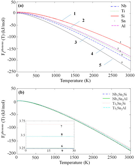 Calculated phonon contribution to free energies for (1) Si, (2) Al, (3) Ti, (4) Nb, (5) Sn, (6) Nb5Sn2Al, (7) Ti5Sn2Si, (8) Ti5Sn2Al and (9) Nb5Sn2Al.