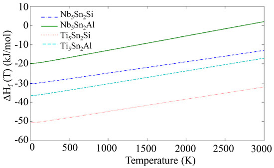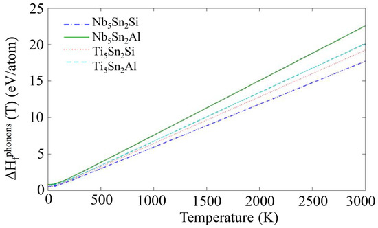 The phonon density of states (DOS) for the compounds and elemental phases can be seen in Figure 2. All the eigenfrequencies were found to be real, hence it was confirmed that the compounds under investigation are mechanically stable. After obtaining the computed phonon, DOS the vibrational contribution to free energies per atom (Fphon (T)) was calculated (see Figure 3). The Fphonon decreased faster in the order: Nb5Sn2Al, Ti5Sn2Si, Ti5Sn2Al and Nb5Sn2Si. After taking Fphonon into account, the phonon contribution to the enthalpy of formation (ΔHfphon (T)) was evaluated (see Figure 4). The ΔHfphon (T) increased faster for Nb5Sn2Al. The differences between the ΔHfphon (T) of the other three intermetallics were very small. In Figure 5 the enthalpy of formation versus temperature of the ternary intermetallic compounds is shown. As the temperature rises, the ΔHf (T) increases more steeply for the Nb5Sn2Al, while the curves of the other three phases show approximately the same slope. The data for the heat of formation at T = 0 K, (), is summarised in Table 4. The () increases from Ti5Sn2Si (−50.655 kJ/mol) to Ti5Sn2Al (−36.471 kJ/mol) to Nb5Sn2Si (−30.296 kJ/mol) to Nb5Sn2Al (−21.516 kJ/mol). Good agreement with available data is shown for Ti5Sn2Si.