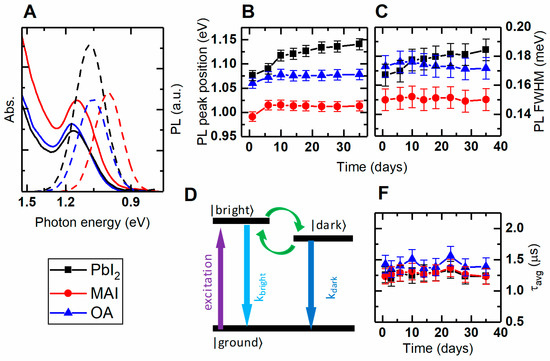 Colloidally-exchanged QDs aging in porous matrix (black squares, PbI2-treated QDs; red circles, MAI-treated QDs; blue triangles, OA-capped QDs). (A) PL peak positions; (B) PL full width at half maximum; (C) PL averaged decay time.