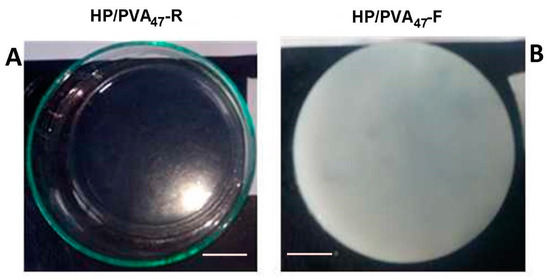 PVA has already been combined with P in applications in cosmetics and drug delivery [34,35]. Both polymers contain hydroxyl groups that can be easily chemically crosslinked with STMP. Moreover, supplementary crosslinking by cryogelation gives scaffolds improved hydrophilicity and mechanical strength. In alkaline conditions, the crosslinking reaction with STMP leads to the formation of biodegradable phosphoester bridges and phosphate pendant groups, negatively charged, favoring a high swelling in water [36,37]. The chemical crosslinking of the two polymers with STMP led to a transparent hydrogel (Figure 1A) whereas additional cryogelation generated opaque hydrogels (Figure 1B); a distinguishing sign for the physical crosslinking of PVA. The composition of HP/PVA hydrogels prepared by different crosslinking methods is presented in Table 1.