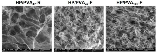 SEM images of the internal structure of hydrogels obtained by chemical crosslinking with STMP and by supplementary crosslinking by cryogelation are presented in Figure 2. All types of hydrogels display a porous structure with interconnected pores. The size of the pores decreases from 30–55 μm for HP/PVA47-R to 15–30 μm for HP/PVA47-F and HP/PVA125-F. In fact, the freezing–thawing procedure induced the crystallization of the polymeric chains of PVA and resulted in a denser network structure, which act as a physical crosslinker. However, through the freeze-thaw technique, there were non-homogeneous networks with areas where PVA can be assumed to be concentrated due to its physical crosslinking (Figure 2, HP/PVA47-F and HP/PVA125-F).