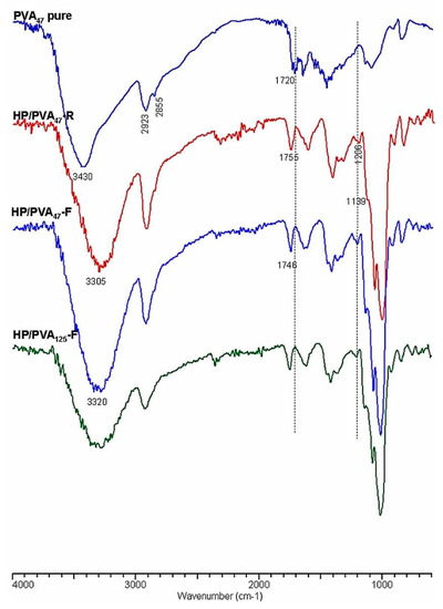 Crosslinking with STMP, and therefore the presence of phosphate groups in the HP/PVA hydrogels, was revealed by Fourier transform infrared spectrometry (FTIR). In Figure 3, the infrared spectra of native PVA and HP/PVA hydrogels prepared by the two techniques are presented and compared. The FTIR spectrum of the native PVA exhibits the typical stretch band of the inter- and intra-molecular OH groups at 3430 cm−1, the stretching bands corresponding to the symmetrical and asymmetric CH2 bonds at 2928 and 2855 cm−1, respectively, and a band at approximately 1720 cm−1, which can be attributed to the presence of the acetoxy group [38]. The IR spectrum of HP/PVA hydrogels shows the presence of the absorption bands characteristic of the two polymers but also the appearance of new bands, confirming crosslinking with STMP. Thus, the inter- and intra-molecular bonds in which the OH groups are involved are evidenced by the presence of the band at 3300 cm−1, and the new significant bands in the 1307–1206 cm−1 region are representative of the presence of the pyrophosphate systems. The adsorption bands corresponding to the phosphate groups appear in the 900–1140 cm−1 region but overlap with those specific to the pullulan. However, one shoulder is present at 1139 cm−1. The disappearance of the 1720 cm−1 band, which is specific to the acetoxy group, is due to the alkaline environment in which the crosslinking reaction was performed. P-O-C bonding in the region between 970 and 1050 cm−1 can also be verified, confirming the presence of crosslinks between PVA and STMP [39].