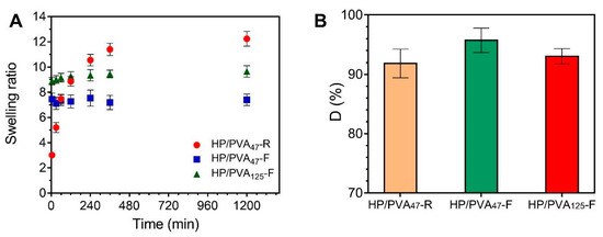Consequently, the swelling kinetics of the two types of hydrogels are different (Figure 4A). The HP/PVA47-R hydrogels gradually take up to 6 hours to swell due to their high porosity and uniform structure of the network. On the contrary, the HP/PVA-F cryogels swell rapidly, reaching equilibrium in approximately 60 min. It can be seen that the HP/PVA125-F cryogels swell more than the HP/PVA47-F one. This behavior is as expected since, for the HP/PVA125 preparation, we used PVA with higher molecular weight and in a smaller final concentration compared with the HP/PVA47-F cryogels (see Table 1). On the one hand, the lower concentration of PVA in the HP/PVA125-F cryogel led to a structure that was less crosslinked, with slightly larger porosity (Figure 2), which increased the equilibrium swelling [42]. Hassan and Peppas (2000) found that, for hydrogels obtained by using higher molecular weight PVA, higher volume swelling ratios are obtained due to an additional crystallization during swelling and increased mobility because of less physical crosslinking [43].