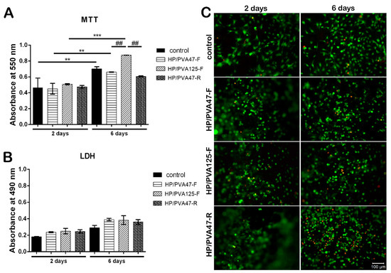 After 2 days of culture in standard conditions, MTT assay results indicated a good biocompatibility on all tested materials, with a slightly increased viability for HP/PVA125-F when compared to HP/PVA47-F and HP/PVA47-R materials (Figure 6A). HP/PVA47-F and HP/PVA47-R had similar viability values with the control. After being in culture for 6 days, the composites started showing different levels of proliferation. The control system showed a statistically significant higher proliferation (p < 0.01) at 6 days in comparison to the level registered at 2 days. The same results were observed for cells cultured on HP/PVA47-F. HP/PVA125-F, which showed a better predisposition for increased viability at first, at 6 days displayed a statistically significant elevation of proliferation (p < 0.001). When comparing the proliferation at 6 days on all three tested composites, HP/PVA125-F showed the highest statistically significant increase (p < 0.01). Furthermore, a slight tendency of increased viability, with no statistical significance, was noticed for cells cultured on HP/PVA47-F material in comparison with the HP/PVA47-R scaffold. By supporting cell proliferation the best, HP/PVA125-F indicated that PVA with P could promote and stimulate cell viability and proliferation.
