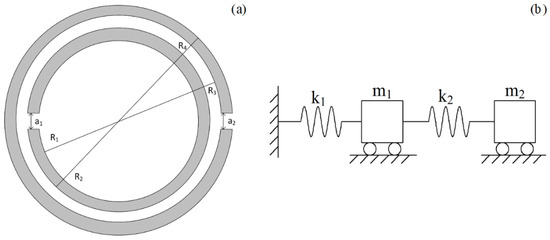 Similarly [23], TLSHSs are nested by two SHSs of different sizes, the schematic of which is shown in Figure 2a. , , and represent the inner radius, outer radius, and the split hole diameter of the inner layer sphere, respectively. , , and represent that of the outer layer sphere, respectively. TLSHSs can be considered equivalent to two spring oscillators in series, as is shown in Figure 2b. When the spring oscillator in series is in steady state, the oscillator function is composed of two resonant frequency components. Based on the above analysis, the formula of the resonant frequency of the TLSHSs is obtained by taking n = 2, and then the two resonant frequencies satisfy Equations (5) and (6) as follows [24,25]: