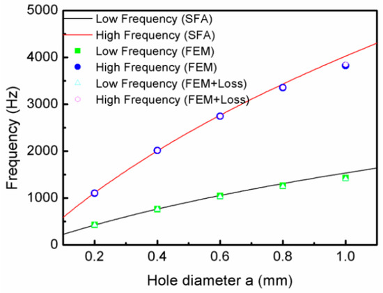 Figure 3 shows the relationship curves of the hole diameter and the resonant frequencies, where the solid square and circle symbols are the low- and high-frequency values, respectively, of the simulation without loss; the hollow triangle and circle symbols are the low- and high-frequency values, respectively, of the simulation with loss; and the lines are the calculation curves resulting from Equations (5) and (6). It is shown in Figure 3 that there were two resonant frequencies for every TLSHS. It is worth noting that the simulation results were in good agreement with the theoretical results. In addition, the simulated low- and high-frequency values without and with loss were basically the same. This is, perhaps, because the thermoviscous loss contributions can be neglected due to the relatively large interlayer cavity [27]. Furthermore, with the increase of the hole diameter, the difference between the low- and high-frequency values became larger. This was because, as the diameter increased, all of the , , , and reduced; increased slowly; and increased quickly, which made the difference larger.