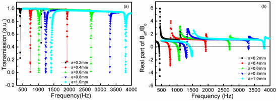 Based on the analysis in Section 2, the diameters of the inner and outer holes were set to be the same, and they are denoted by a. The effect of the hole diameter of TLSHSs on the transmission properties was analyzed. Here, the hole diameter was set to 0.2, 0.4, 0.6, 0.8, and 1 mm, respectively, and the other parameters are listed in Section 2.