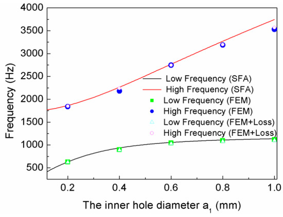 Figure 5 shows the relationship curves of the inner hole diameter and the resonant frequencies, and the solid square and circle symbols are the low- and high-frequency values, respectively, of the simulation without loss; the hollow triangle and circle symbols are the low- and high-frequency values of the simulation with loss; and the solid curve is the calculation curves according to Equations (5) and (6). Figure 4 shows that there were two resonant frequencies for every TLSHS, and this number was independent of the diameter of the inner hole. Furthermore, the simulation and theoretical results were in good agreement. In addition, when the diameter of the inner hole was enhanced, the gap between the two frequencies became wider. The reason for this is that, as the inner hole diameter increased, reduced and both and decreased. Thus, according to Equations (5) and (6), increased slowly and increased quickly.