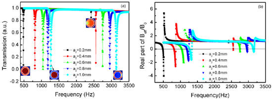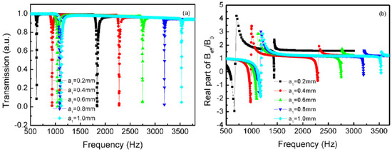 The curves of TLSHSs with various relative volumes: (a) transmission and (b) effective modulus.