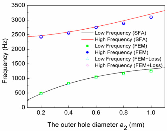 Figure 7 depicts the relationship curves of the outer hole diameter and the resonant frequencies. There were two resonant frequencies for every TLSHS, and the simulation values were consistent with the theoretical values, as shown in Figure 7. Furthermore, the gap of the two frequencies varied slightly with the enlarging of the outer hole diameter. For instance, when the outer hole diameter was 0.2 mm, the gap was 1936 Hz, and when the diameter was 1.0 mm, the gap was 1872 Hz.