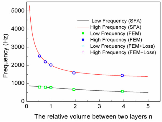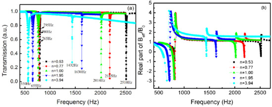 In order to investigate the influence of the relative volume of TLSHSs on the transmission properties, the volume of the inner cavity was fixed at , and the ratio of the two layers’ volumes was denoted by n varying from 0.53 to 3.94.