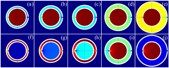 COMSOL Multiphysics with the finite element method (FEM) was used to establish and simulate the TLSHSs, where the Thermal Acoustic Module or the Pressure Acoustic Module was selected to estimate the effect of the thermoviscous losses on the acoustic properties, separately [26]. TLSHSs were placed in the middle of the waveguide. The left side of the waveguide was set to an incident boundary, the right side was set to a matched boundary, and the other side of the waveguide was set to a hard boundary. Sound went inside from the left of the waveguide and perpendicularly entered the outer hole of the TLSHSs. Further, the inner part of the waveguide and the cavity in the TLSHSs were provided with air medium. Considering the thermoviscous loss, the air was set as a viscous flow. The Thermal Acoustic Module was applied to the narrow domains of the interlayer and the two holes, and the Pressure Acoustic Module was applied to the inner cavity and the other domain. In the calculation, the density of the TLSHSs was 1000 kg/m3, the Young’s modulus was set to 2 × 108 Pa, and the Poisson’s ratio was 0.37. The density of air was 1.29 kg/m3, the speed of sound in air was 320 m/s, and the attenuation coefficient was 0.01 m−1. Furthermore, we primarily set mm, mm, mm, mm, mm, and mm.