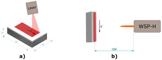To facilitate an accurate determination of the heat treatment variants’ influence, the as-sprayed coatings were polished down using a P600 diamond disc. Subsequently, the samples were subjected to one of two methods of surface heat-treatment: laser or plasma. The laser treatment was performed using a high power diode laser (Laserline GmbH, Muhlheim-Karlich, Germany) with maximal output power of 9 kW, = 915–1030 nm, 1000 μm fibre diameter, 400 mm focal length and laser focus diameter 7.5 mm. The laser transverse velocity and power were varied to obtain 15 different laser heat-treatment conditions in total. On the other hand, high enthalpy plasma generated heat produced by the plasma torch offers a quick and readily available alternative since the heat treatment can be performed directly after the coating deposition using the same plasma torch that was used for the coating deposition. The torch transverse velocity and power were modified, in order to prepare 6 different plasma heat-treatment conditions. The samples were mounted into a stationary sample holder and heat-treated by a single pass of the plasma torch at a stand-off distance of 150 mm. A schematic illustration of the two surface heat-treatment methods is provided in Figure 1.