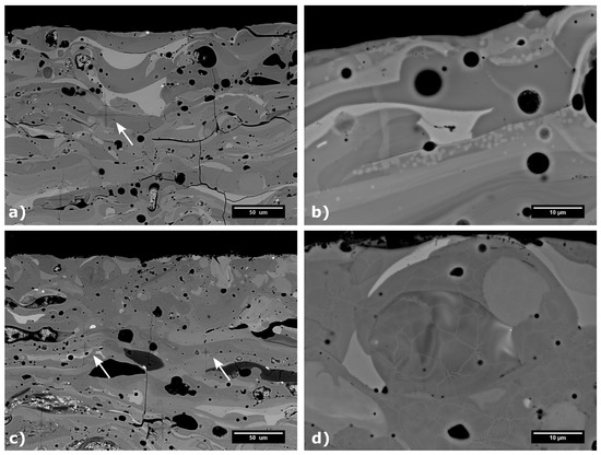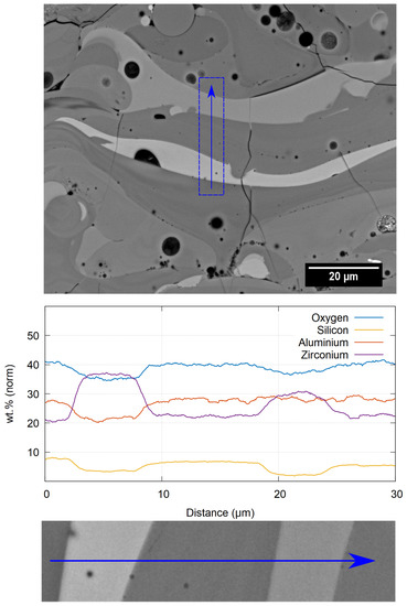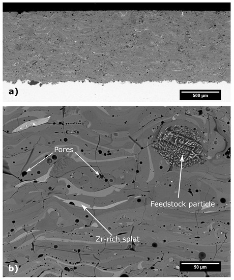 Cross-sections, prepared from the as-sprayed coating, were analysed using SEM in Back Scattered Electron (BSE) mode to observe the microstructure and overall coating quality. As seen from Figure 2a, the coatings evenly covered the substrate and adhered well to it with neither delaminations nor vertical cracks observed. The average chemical composition of the coating in wt.%, as evaluated by EDX, was: 51 ± 1 Al2O3, 33 ± 2 ZrO2, 13 ± 1 SiO2, with traces of Fe- and Na-oxides. From the magnified view in Figure 2b, it can be observed that individual splats differed significantly in the shade of grey, which is caused by variations of their chemical composition. The brighter the splat, the more ZrO2 it contains, while darker splats are richer in Al2O3, as was confirmed by EDX analysis (see Figure 3). Apart from the compositional variations of the splats, some unmelted feedstock particles were observed embedded in the as-sprayed coating. These particles can be easily recognized by their original eutectic microstructure (Figure 2b), which was retained from the feedstock powder. The amount of unmelted particles within the coating was 4.4 ± 0.9%, as evaluated by the image analysis. The magnified view also shows short micro cracks within the coating, with an average length of about 80 μm. The total porosity of the as-sprayed coating, as evaluated by the image analysis, was 4.7 ± 0.2% and consisted mainly of globular pores with average size around 8 μm2.