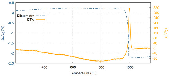 Free standing ceramic samples were prepared from the as-sprayed coatings by grinding off the substrate. These samples were used for Differential Thermal Analysis (DTA) to obtain crystallization temperature of the amorphous samples. The DTA showed onset crystallization peak at 984 °C, and the crystallization was fully finished at 1015 °C, as shown in Figure 4. Moreover, thermal dilatometry was measured suggesting a rapid linear shrinkage of 2.47% observed at crystallization temperature (blue dash-and-dot line in Figure 4). The average value of the coefficient of thermal expansion (CTE) before crystallization, determined from measurement of displacement, was (3.5 ± 0.7) × 10−6 K−1 and changed to (6.1 ± 0.4) × 10−6 K−1 after crystallization. When the identical sample was subjected to a second measurement of displacement, CTE remained constant within the full temperature range up to 1300 °C, suggesting that the primary crystallization is an irreversible transformation.