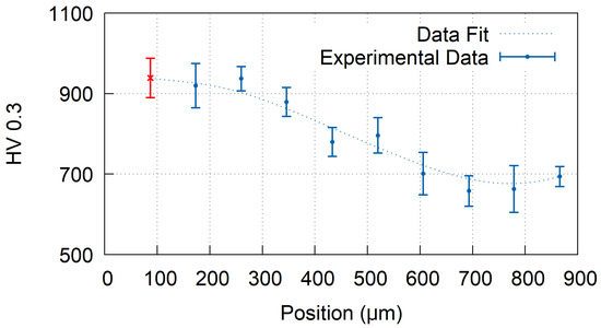 Microhardness profile of the laser heat treated sample L4. For samples with gradient hardness, the value closest to the surface (red color) was taken as reference.