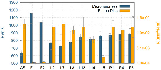 Pin on Disc wear resistance was evaluated for selected samples. The criteria for samples selection were based on following parameters: (i) significant change in surface microhardness and (ii) cracks in the coating of type 0 or 1 only. Based on these criteria, nine surface heat treated samples were selected, along with the as-sprayed sample and two furnace heat treated samples as the reference. The determined values of wear resistances of the coatings, presented by material volume loss K, are listed in Table 1. Graphical interpretation of hardness and wear resistance of the samples is pictured in Figure 8.