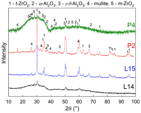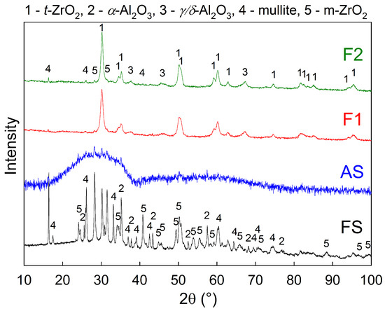 The original crystalline feedstock powder was transformed during spraying to almost fully amorphous coatings, as can be seen from the diffraction patterns in Figure 9 and Table 2, where FS and AS stand for feedstock powder and as-sprayed coating, respectively. Subsequently, the amorphous phase was partially transformed back to crystalline during heat treatment, forming mainly t-ZrO2 nano-crystals, together with -Al2O3 and m-ZrO2. Silicon dioxide, present in the original feedstock, remained in the amorphous phase, or transformed to mullite (3Al2O3·2SiO2), depending on the heat treatment conditions of the samples.