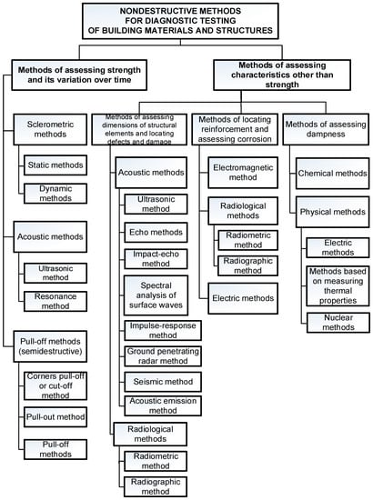 Figure 3 shows a detailed classification of non-destructive methods useful for diagnosing buildings and building materials [2,3].