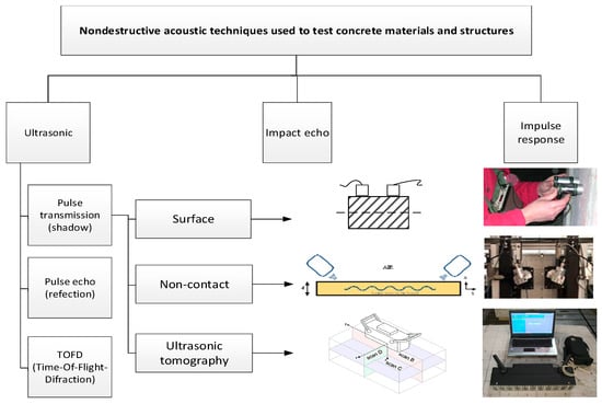 Classification of non-destructive acoustic methods suitable for testing concrete materials and structures [1,2].