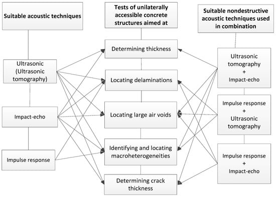 Figure 4 shows a slightly modified classification (based on [2]) of the acoustic methods suitable for testing concrete materials and structures. This classification was presented in [1]. Figure 5 shows (on the basis of [1]) the suitability of the particular state-of-the-art non-destructive acoustic methods, used individually or combined for testing concrete and materials structures.