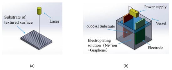 This section presented procedures of the duplex treatments of surface modification-surface texturing on 6065Al matrix. The scheme of this processing is shown in Figure 1. Here, Texture surface was fabricated by using laser processing and then the graphene/Ni composite electroplating processing was carried out on the textured surface.
