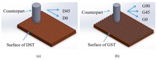 Here, to explore different texture surface influence on the friction result, two friction directions (parallel and 45° to dimple arrangement) for dimple texture surface were tested, referred to as D0 and D45 in the following Figure 3, table and chapter. Three friction directions (parallel, 45° and vertical to the groove direction) for groove texture surface were tested, referred to as G0, G45 and G90, respectively, in the following Figure 3, table and chapter.