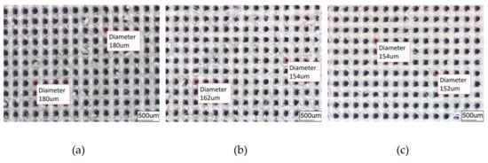 A P50Q pulsed fiber laser (Wuhan Raycus Fiber Laser Technologies CO, LTD, Wuhan, China) with 1060 nm wavelength was employed here to fabricate the needed surface texture. Referring to other researchers, dimple and groove surface texture were adopted, which are based on the two typical wear resistant and corrosion resistant surfaces of lotus leaf and shark skin [21,22]. Detailed parameters were listed in Table 2. Laser processing parameters used were as follows: laser power of 45 W, scanning speed of 200mm/s, scanning time 10 min. After laser treatment, the hardness of substrate (41.4 HV) can be improved to HV 102.2 HV after laser processing, which benefits the enhancement of the properties of the textured substrate (as shown in Figure 2).