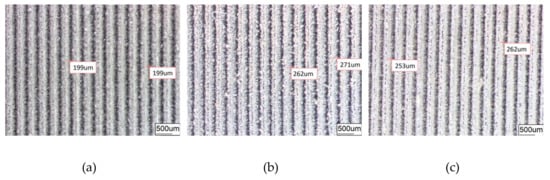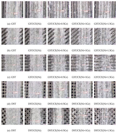 Groove surface texture morphology obtained under different conditions. (a) GST samples; (b) GST/CE (Ni) samples; (c) GST/CE (Ni-1.5Gr) samples.