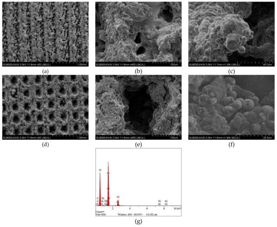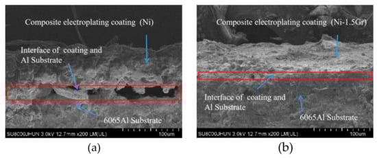 The average diameter of the original dimple shown in Figure 4a is around 200 μm and the diameter in both in Figure 4b,c was reduced to be around 160 μm. Similarly, the width of the groove surface texture in Figure 3a is about 200 μm, and the width in both in Figure 5b,c increases to about 260 μm. It was found that the pit diameter and groove width of the samples are in good agreement by measuring several different positions on the surface of the sample, which indicates that the coating is continuous and uniform. As can be seen from Figure 6, sectional images of the GST electroplating coatings show the electroplating coatings and the alloy matrix are uniformly and tightly connected. Compared with the textured nickel coating, the GST graphene/nickel composite coating has better bonding with the Al alloy substrate, and there are no obvious impurities and defects at the interface. The uniformity of the pit diameter and groove width on the surface of the sample is very good by measuring multiple positions of the sample, which shows that the coating is continuous and uniform. During the composite electrodeposition, Ni2+s would be preferably electrodeposited onto the graphene and lead to the formation of microbulges on the electroplating coatings. In the process of composite electrodeposition, Ni2+s would be preferentially electrodeposited onto graphene and encapsulated graphene which finally lead to form micro-convex bulges on the electroplating surface. This phenomenon can be found in Figure 6c and Figure 7f and similar observations were also reported by Jiang [10]. Thus, the surface morphology of the composite electroplating coating with the different contents of graphene is probably correlated to the electric force between the composite and the Ni matrix during deposition, which influences the absorption of composite on the surface of the electrodepositing layer [26]. The EDS result in Figure 7g gives that the content of C and Ni are estimated to be 3.496% and 64.214%, respectively, which indicates that graphene were successfully adsorbed on the graphene/Ni composite electroplating coating during electrodeposition, which could greatly increases the number of nucleation sites for Ni2+ to reduce, resulting in a fine grained and intact arrangement of Ni crystals [27]. The chlorine is shown in the EDS and it may be introduced by nickel chloride during electroplating.