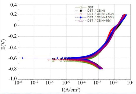 As can be seen from Figure 8 and Table 4, the corrosion potential and corrosion current density for DST samples are −655.44 mV and 469.92 μA/cm2, respectively. For DST/CE(Ni) samples, the corrosion potential increases to −618.63 mV, which means the corrosion resistance of 6065Al sheet is improved to a certain extent. Furthermore, there was a significant positive correlation between the corrosion resistance and graphene content from test result. The DST/CE(Ni+1.5Gr) get the most notable improvement of corrosion resistance. The corrosion potential of the composite coating moves forward to −601.69mV, and the corrosion current also decreases by 13.90% to 404.58 μA/cm2. Meanwhile, the corrosion test parameters of stripe textured composite electroplating coatings also appeared a similar trend. This result is consistent with another study [10], in which the addition of graphene played a much more obvious role in improving the corrosion resistance during the electrodeposition of Ni.