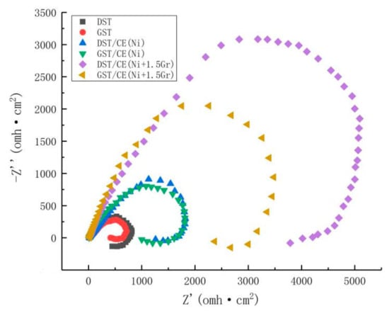 The corrosion resistant properties of textured graphene/nickel composite electroplating coatings were evaluated by the electrochemical impedance tests. The Nyquist plots of all the surfaces with different treatments were shown by Figure 10. Usually, the larger diameter of capacitive loop in Nyquist plot implies higher corrosion resistance [30]. From Figure 10, we can find that DST/CE (Ni+Gr) coatings exhibit remarkable higher impedance compared to GST/CE (Ni+Gr) coatings and the impedance of coating increased with higher graphene content. These results are consistent with that of potentiometric polarization curve analysis. DST/CE (Ni+Gr) coating have the highest impedance and better corrosion resistance in plating bath containing the largest amount of graphene addition.