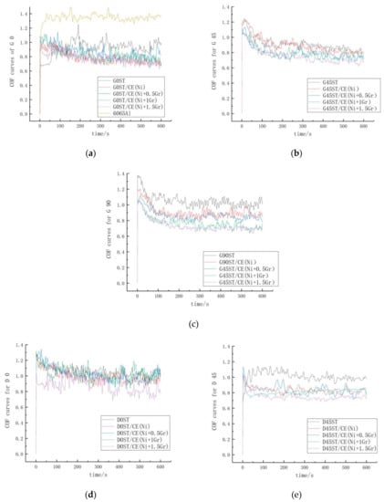 Friction coefficient under stable friction for different ST/CE surface. (a–c) The stable friction coefficients of GST at 0°, 45° and 90°, respectively. (d) and (e) the stable friction coefficients of DST at 0° and 45°, respectively.