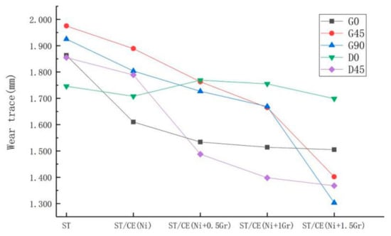 It is also possible to verify that graphene reduces friction by comparing the trend of worn trace width on composite coatings with different graphene additions in Figure 12. Generally speaking, the worn trace decreases with the increase of graphene content under various friction conditions. The biggest decrease is that the groove sample with 1.5 mg graphene added in the vertical friction direction decreases from 1.925 mm to 1.303 mm, with a decrease of 32.31%. This apparent decrease in worn trace width can be explained by the micro-bulges of the composite electroplating coating with 1.5 mg addition content of graphene and the groove textured composite surface has the best anti-friction property perpendicular to the striate direction. The results of Figure 13 also show that when graphene content is 0.5 and 1.0, the width of friction marks in parallel fringes is lower than that in vertical fringes. This is because the surface will be more uneven when vertical fringes are rubbed. As can be seen from Figure 9a,c,e, the real-time friction coefficient jitter of vertical fringes is greater in the first 100 s. It will make the coating adhere to the friction material during the friction process, which will lead to the increase of the friction loss. However, in general, with the increase content of graphene, the groove textured graphene/nickel composite electroplating coating exhibits an optimum wear resistance when rubbed in the direction of vertical stripes.