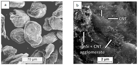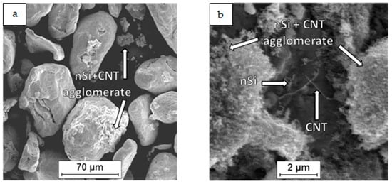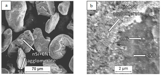 | Mg+(nSiD + CNTD) | 97% Mg; 2% nSi; 1% CNT | - separate de-agglomeration nSi and CNT - preparation of (nSi)D + (CNT)D suspension - addition of Mg to (nSi)D + (CNT)D suspension | |