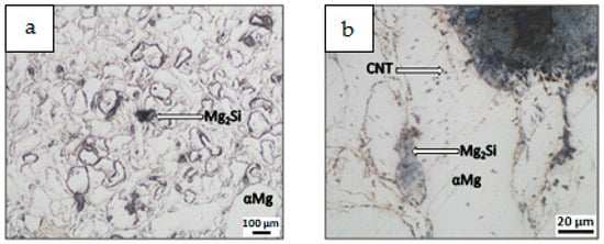 - The procedure for preparing the Mg-nSi-CNT mixture, which was proposed as the most effective, ensured the lowest porosity and the highest hardness of the Mg-Mg2Si-CNT composite obtained by sintering under pressure.