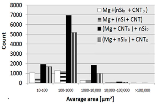 - Differences in the microstructure of the Mg-Mg2Si-CNT composite depending on the initial morphology of the powder mixture were observed. The most noticeable changes were in the size of the Mg2Si particles, where the values could be very high (a few dozen micrometers in diameter), when nSi re-agglomeration occurred. Simultaneously, the size of the CNT agglomerates, detected in the composite, often surrounded by the Mg2Si phase, was also greater.