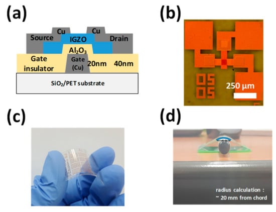 (a) Schematic cross-sectional image of the flexible indium-gallium-zinc oxide (IGZO) thin-film transistor (TFT) fabricated on the polyethylene terephthalate (PET) substrate. (b), (c) Photographic images of the fabricated flexible IGZO TFT. (d) Photographic image of the customized bending plate with a ~20 mm bending radius.