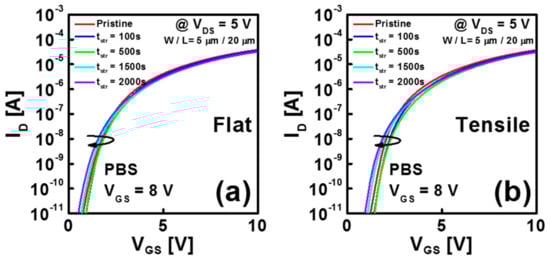 Change of transfer curves as a function of the applied stress time under a VGS stress of 8 V in flexible IGZO TFTs (a) at the flat state and (b) under the mechanical-bending stress.