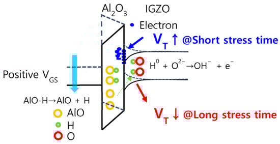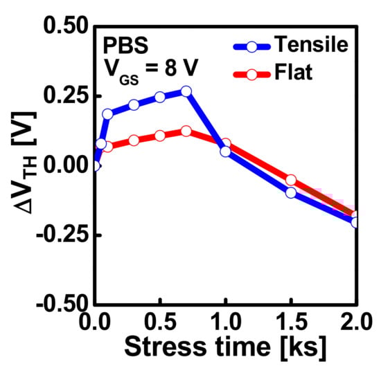 Figure 2a,b display the change of transfer curves as a function of the applied stress time under a positive VGS of 8 V in flexible IGZO TFTs at the flat state and under the mechanical-bending stress, respectively. Measurements were made for TFTs with a W/L of 5 μm/20 μm at a VDS of 5 V at RT. Figure 2a,b show that the IGZO TFTs exhibit VTH turnaround characteristics under both mechanical stress conditions. VTH shifts in the positive direction during the initial 500 s; but shifts in the negative direction after 500 s of stress. In previous works, the PBS-induced VTH turnaround behavior was already observed in IGZO TFTs with a low-temperature ALD Al2O3 gate dielectric and was mainly ascribed to the effect of electron trapping and hydrogen release and diffusion []. The positive shift of VTH at the initial stage of PBS was explained by the electron trapping in traps at the Al2O3/IGZO interface or bulk Al2O3, and the negative shift of VTH after a long stress time was mainly attributed to the hydrogen diffusion from a low-temperature ALD Al2O3 gate dielectric into an IGZO layer. The hydrogen atom was assumed to be generated from the breakage of residual AlO-H bonds in the ALD Al2O3 by the energetic electrons in the TFT channel during PBS application []. When Al2O3 is deposited using ALD at low temperatures, the chemical reaction between AlO-H and TMA is less complete, which causes considerable AlO-H residues in Al2O3 []. As hydrogen is the effective donor in IGZO through the reaction of H0 + O2−→OH− + e− [], the hydrogen doping shifts the VTH. of the IGZO TFT in the negative direction.